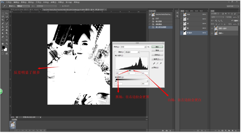 鼠标右键复制绿色通道,选中绿色通道,按【CTRL+L】色阶处理,能使图片反差更明显,