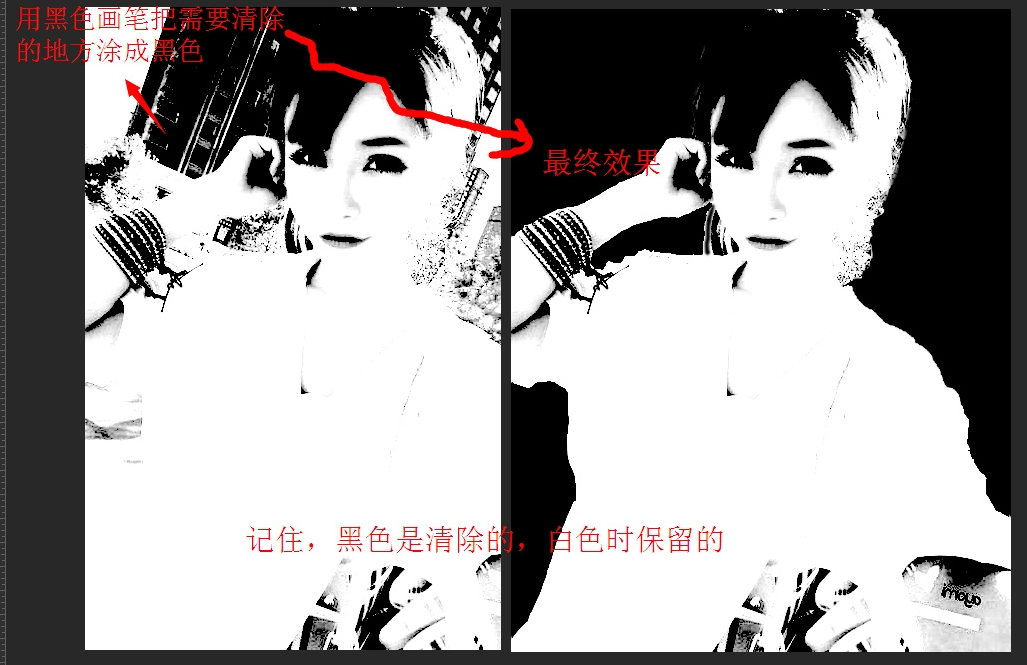 然后用画笔工具把需要清除的地方涂黑,如看不清边缘,点击RGB图层进行选区,再换回绿色通道,用油漆桶涂黑,