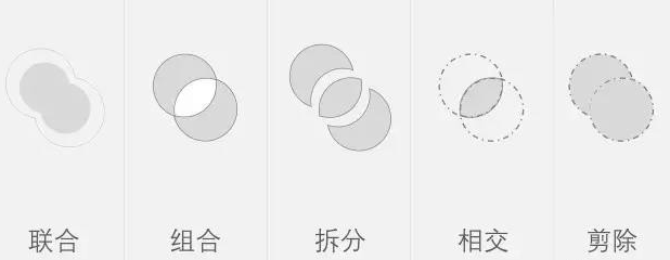 在PPT中,布尔运算是以【合并形状】这一功能的形式出现,包括相交、联合、组合、拆分、剪除这五项操作。