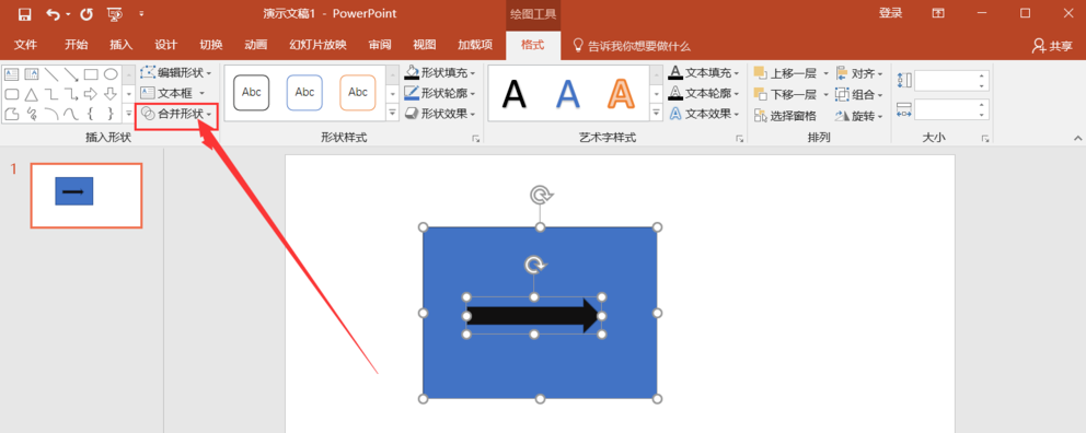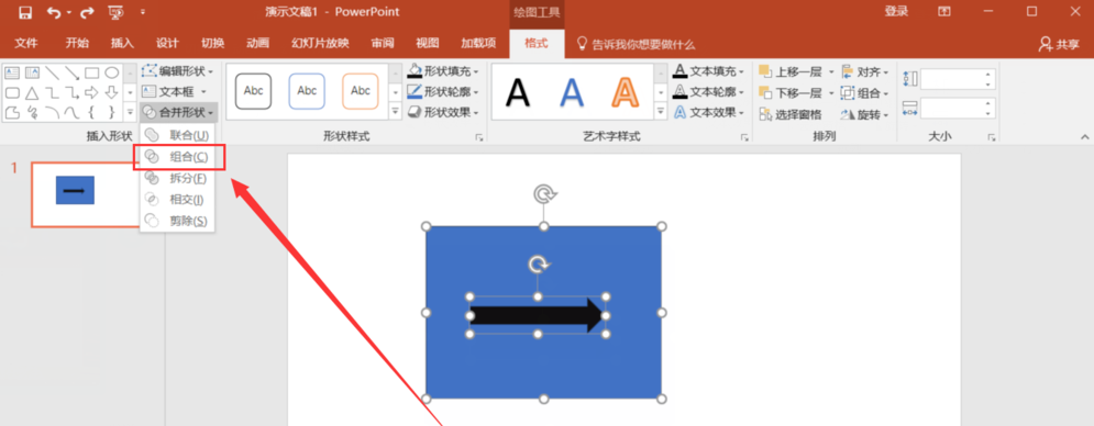 按住Ctrl键,将两个图形全部选中,点击菜单栏中的【格式】——【合并形状】选项,如图,