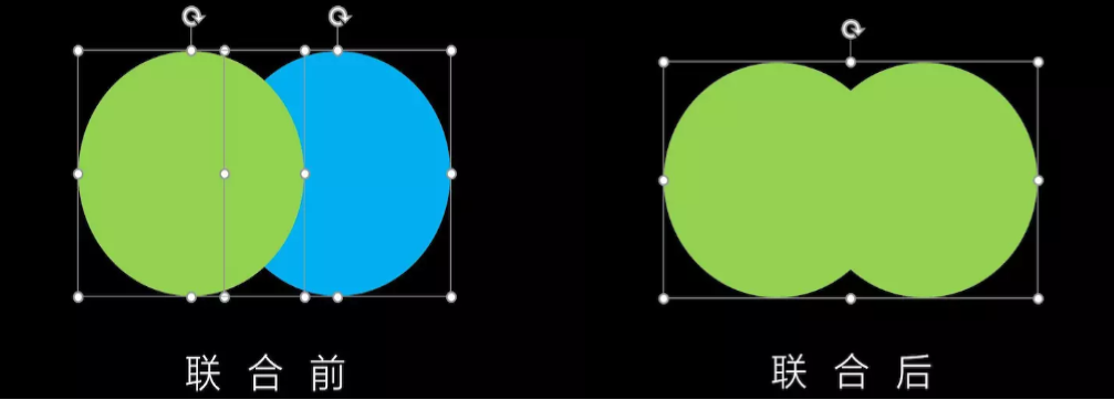 将两个形状进行合并(两个圆形),为什么最后的形状是绿色的?这是因为我先选中的是绿圆,系统会以第一个选中的形状的颜色作为最后运算后的形状颜色。