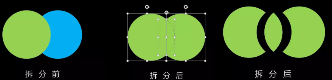 拆分,就是把两个形状相交所形成的区域进行拆分,如图。