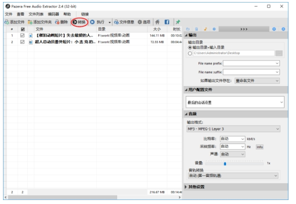 打开Pazera Free Audio Extractor软件,点击【添加文件】,导入视频,勾选视频文件,在界面右侧设置音频格式、输出目录,然后点击上方的【转换】按钮,开始提取音频。提取完成,音频自动保存在本地文件。