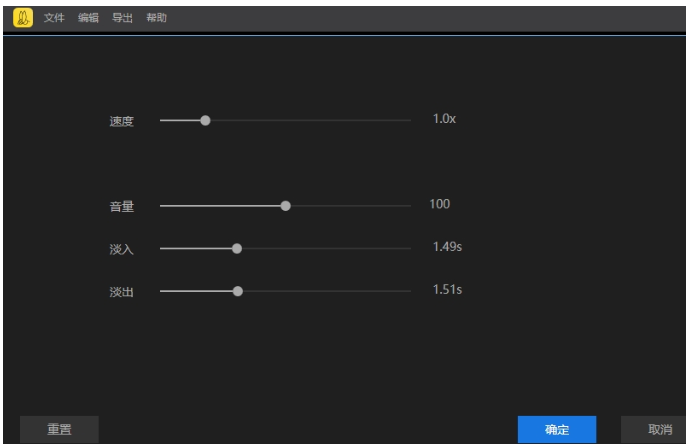 双击音频轨道上的音乐,弹出音频编辑框,对音乐的播放速度、音量进行调整,也可以加入淡入淡出效果,