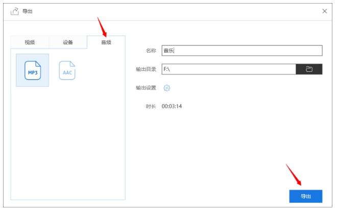 处理完成,保存导出音频文件,点击【音频】——【MP3/AAC】,设置文件名称和保存目录,点击导出。