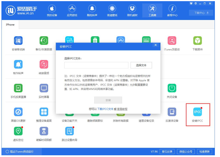打开爱思助手,点击【工具箱】——【安装 IPCC】,根据自己的运营商和使用地区下载对应IPCC文件,进行安装。