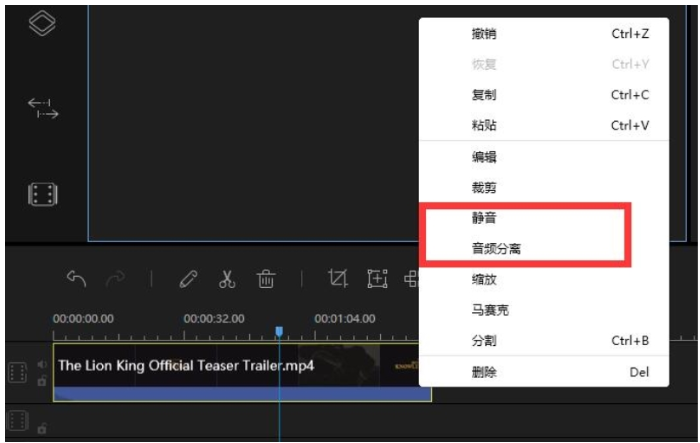 如果想要消除视频中的原声,右击轨道上的视频素材,点击【音频分离】,删除分离出来的音频,或者直接选择【静音】,