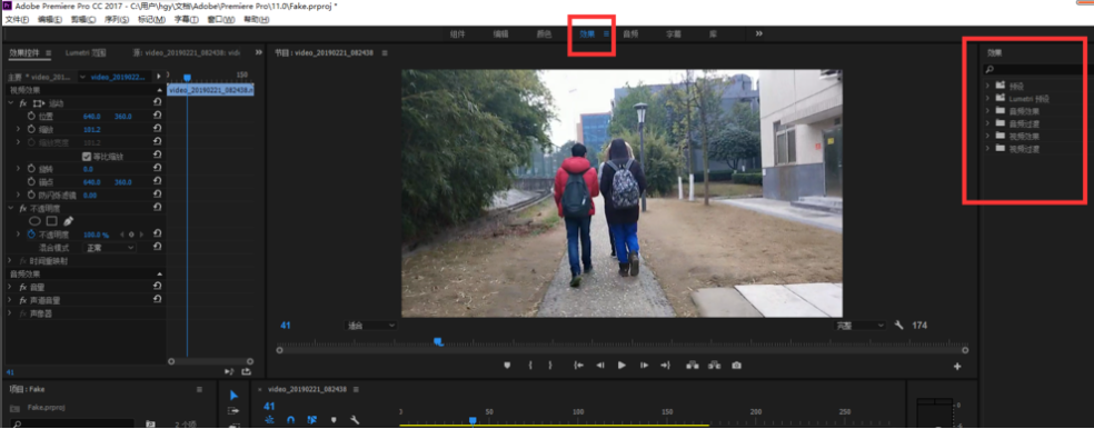 点击上方的【效果】按钮,进入效果窗口,右边会出现效果工具栏,