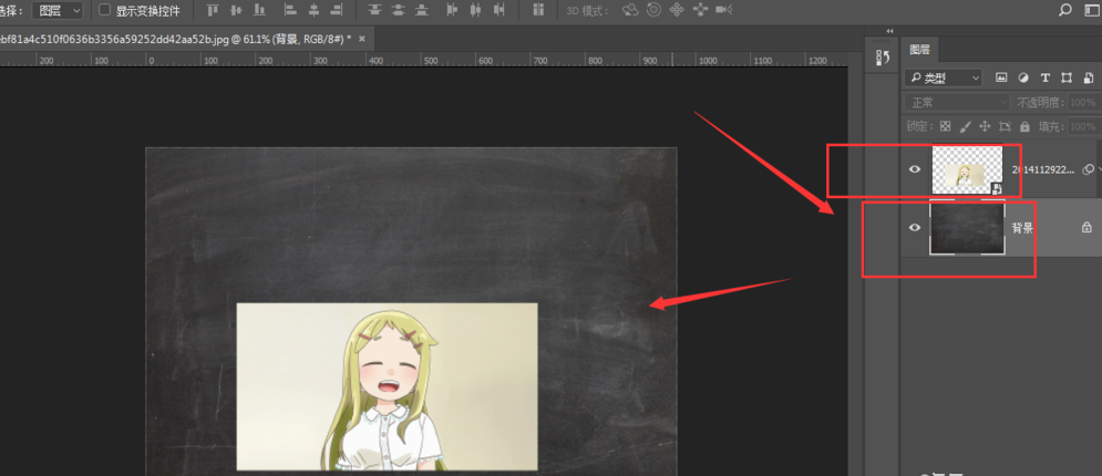 打开Photoshop软件,先导入一张背景图(黑板图片),然后再添加一张人物图片,