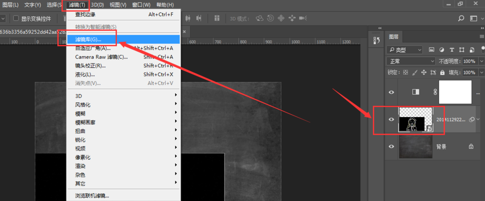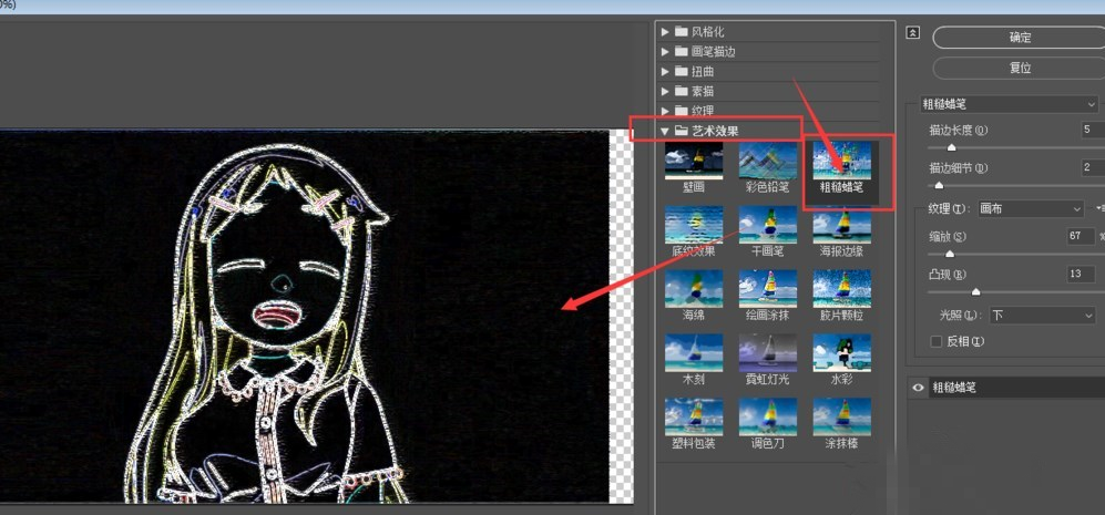 再次选中图片,点击菜单栏中的【滤镜】——【滤镜库】,设置艺术效果为【粗糙蜡笔】,适当调整属性值,
