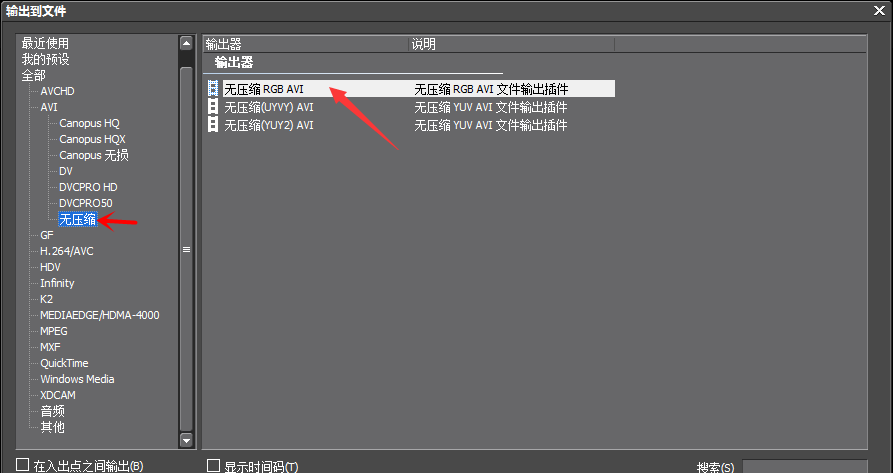 这时会弹出【输出到文件】设置窗口,在左侧点击【无压缩】,选择【无压缩RGB AVI】,点击输出,