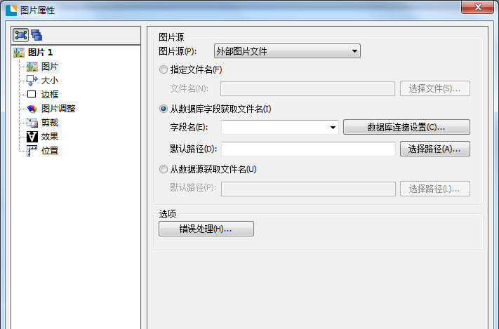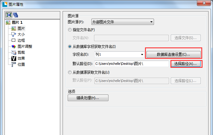 点击工具栏中的图片按钮,弹出下拉列表,勾选【从数据库字段获取文件名】,鼠标单击标签,弹出【图片属性】对话框,
