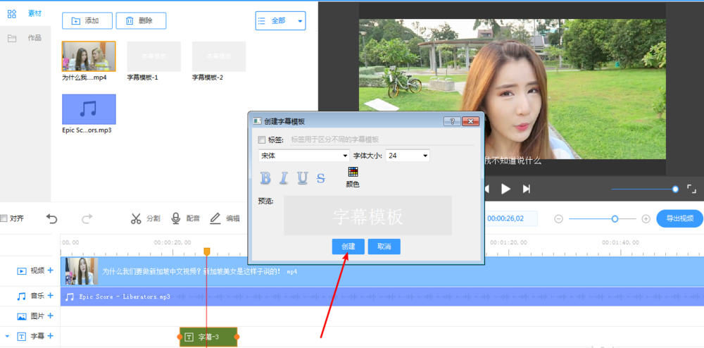 点击【字幕】图标,弹出创建字幕模板窗口,点击【创建】,