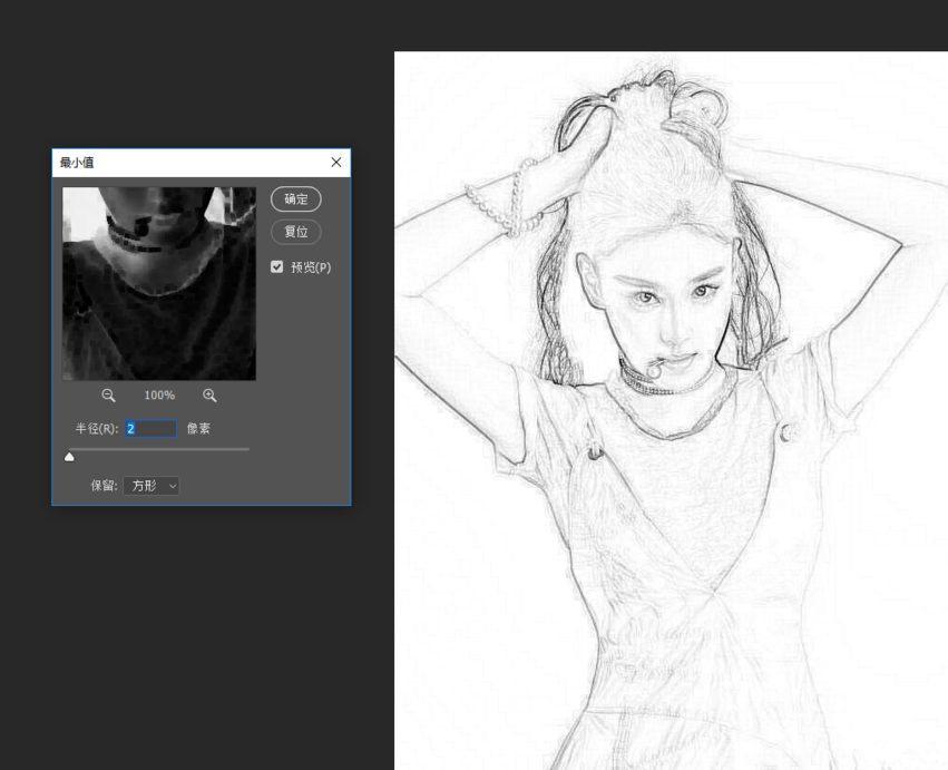在菜单栏中点击【滤镜】——【其他】——【最小值】,数值为2,