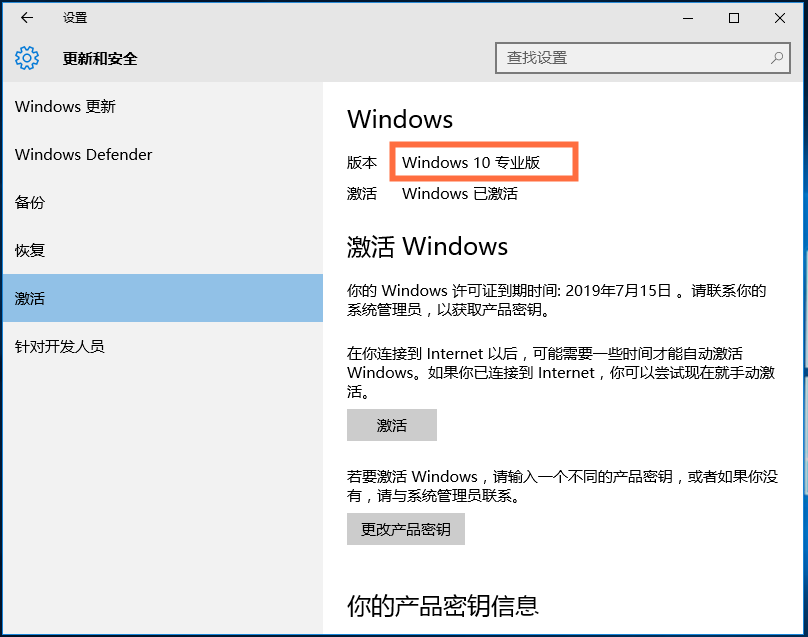 进入系统设置界面,点击【更新与安全】——【激活】,你也可以看到Windows许可证到期时间,并确定Win10版本,