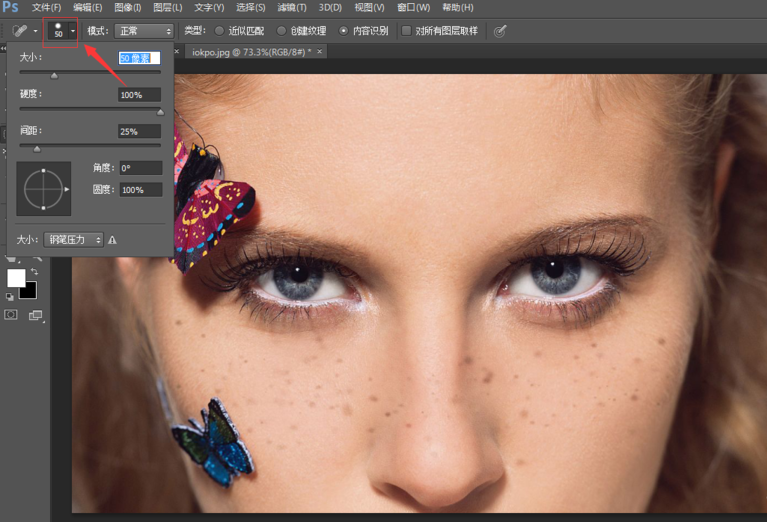 用污点修复工具不断点击雀斑,你会发现雀斑不见了,