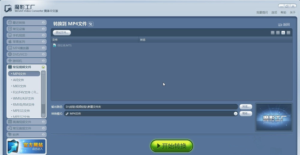 打开魔影工厂,进入主界面,在左侧点击【常见音频文件】,选择格式,弹出对话框,导入视频文件,