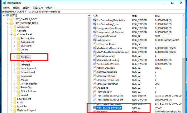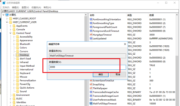 进入注册表编辑器,依次展开HKCY_CURRENT_USER->Control Panel->Desktop,在右侧双击WaitToKillAppTimeout,