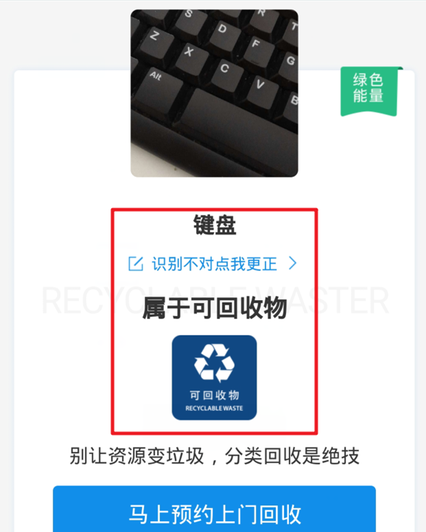 同时,支付宝提供了回收垃圾的服务,用户通过扫描识别垃圾,可直接跳转到“易代扔”小程序,直接在线预约上门回收。