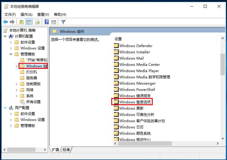 接着点击【Windows组件】,在左侧找到【Windows登录选项】,