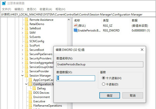 4. 双击“EnablePeriodicBackup”,将其赋值为“1”;