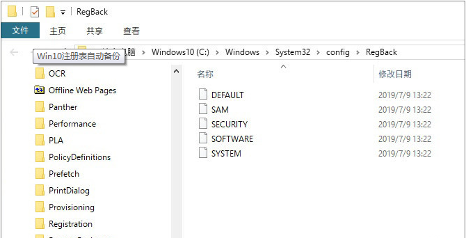 重启系统后,Windows 10会自动在每次开机时备份注册表,通过“C:\\Windows\\System32\\config\\RegBack”可以查看到最新版备份文件。开启后,每次开机会自动备份注册表