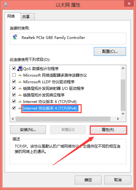 弹出窗口,选择【Internet协议版本4】项目,点击【属性】,