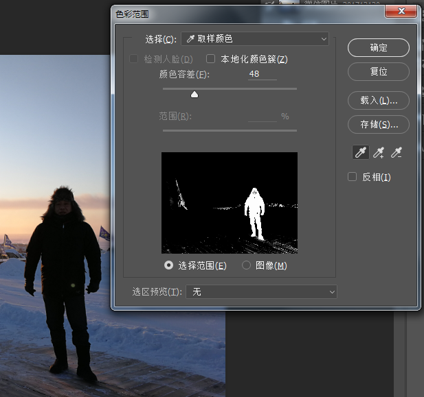 将图片导入到PS软件,在菜单栏中点击【选择】——【色彩范围】,弹出窗口,选中需要调整的区域,