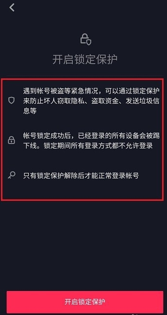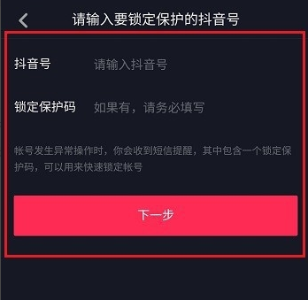 点击【开启锁定保护】,输入抖音号,点击【下一步】,进行验证,验证通过,即可锁定账号。