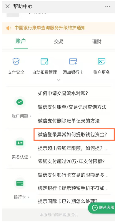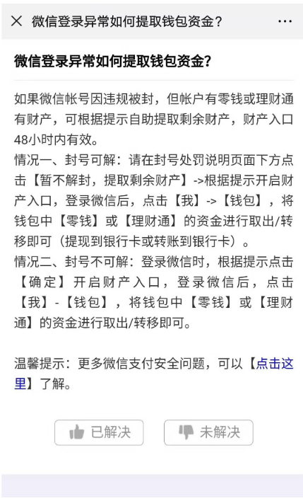 如图,找到并点击【微信登录异常如何提取钱包资金】,查看官方说明,
