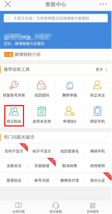 进入客服中心页面,点击【修正粉丝】选项,