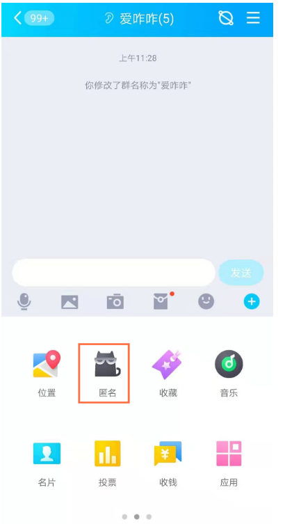 随意点击一个QQ群,进入聊天窗口,点击【+】,滑动选项,点击【匿名】,