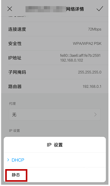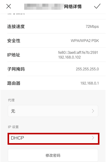 在该无线网的详情界面中找到IP配置下,此时设置的是【DHCP】,也就是动态IP地址,点击设置它。