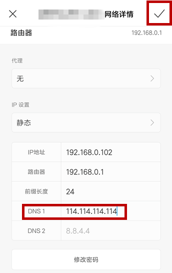 选择好后返回网络设置界面,我们把DNS修改为【114.114.114.114】,然后点击右上角的【√】保存修改。
