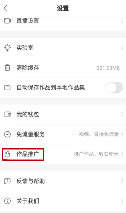 进入设置界面,找到【作品推广】功能并打开,