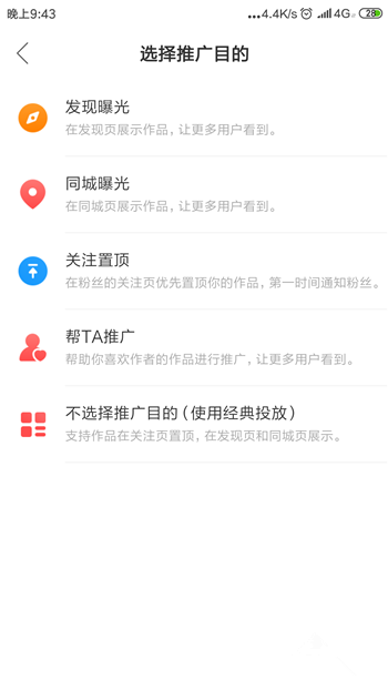 然后选择推广作品的途径,比如在发现页或者同城页等,这样就可以推广自己的作品啦,自然会快速增加粉丝。