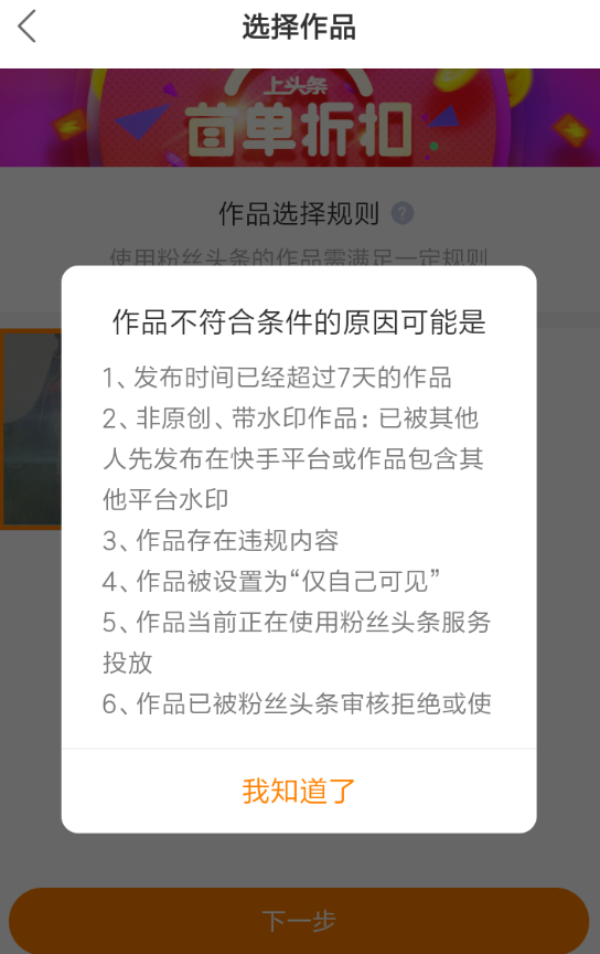 6、作品已经被快手官方拒绝审核,或者上头条的功能达到次数上限。