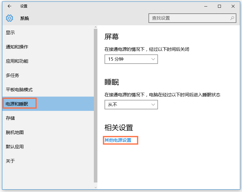 点击【系统】,进入如图界面,然后点击【电源和睡眠】——【其他电源设置】,
