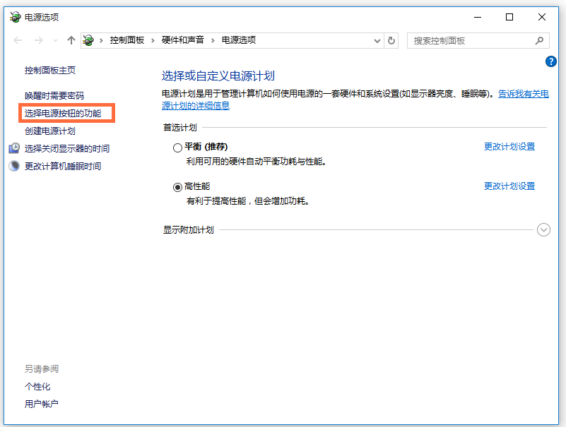 打开电源选项界面,在左侧点击【选择电源按钮的功能】,