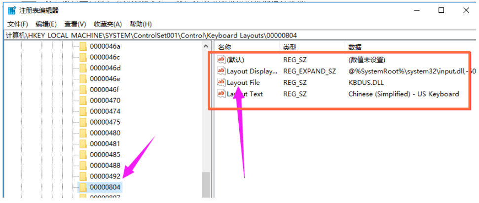 打开注册表编辑器,点击路径【HKEY_LOCAL_MACHINE\\ SYSTEM\\ControlSet001\\Control\\Keyboard Layouts】,仔细检查,会发现以0804结尾的都是简体中文输入法,