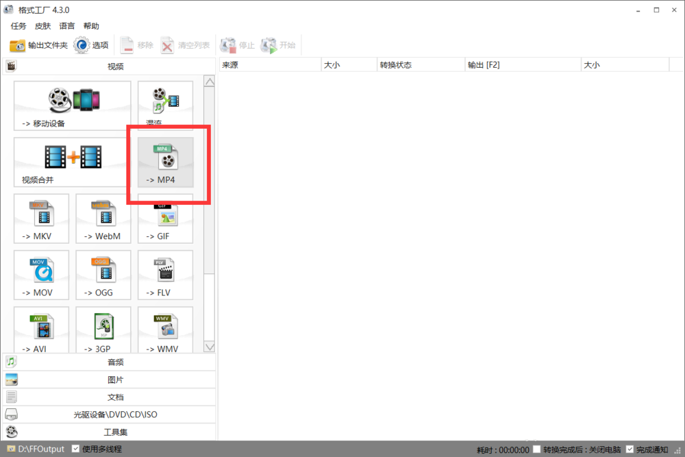 打开格式工厂,进入界面,选择一种视频格式,点击【MP4】,