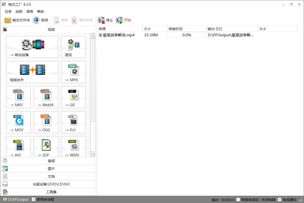 如图,点击【开始】,等待一会儿,即可转换完成,然后将视频输出保存。