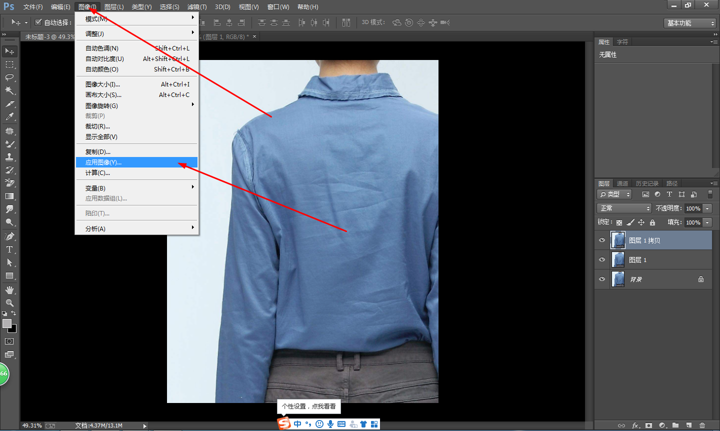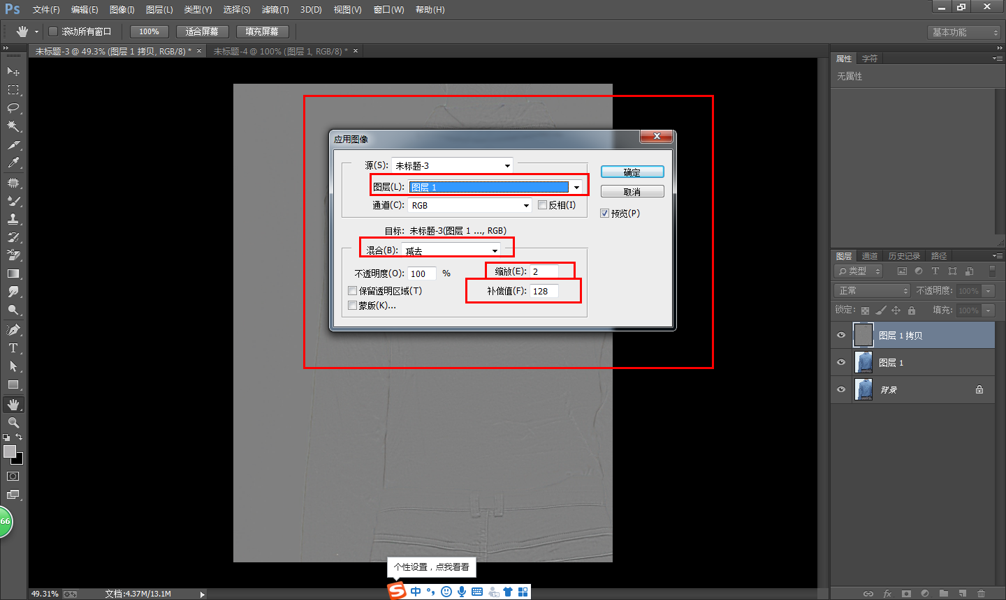 在菜单栏中点击【图像】——【应用图像】,弹出窗口,点击【图层】,选择图层1,【混合】模式选择减去,【缩放】改为2,【补偿值】改为128,