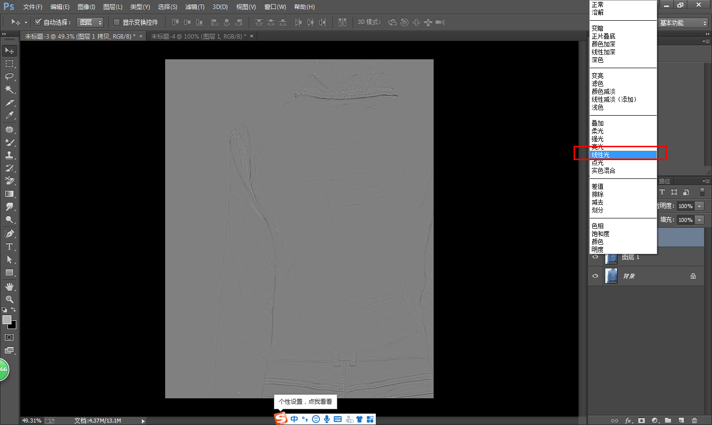 然后将图层1拷贝的图层混合模式改为【线性光】,