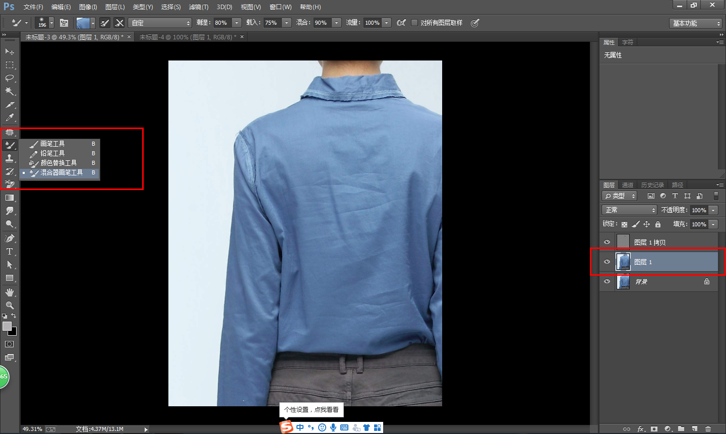 选中图层1,点击混合器画笔工具,按住alt键,进行取样,然后沿着衣服的上下轮廓进行擦动,