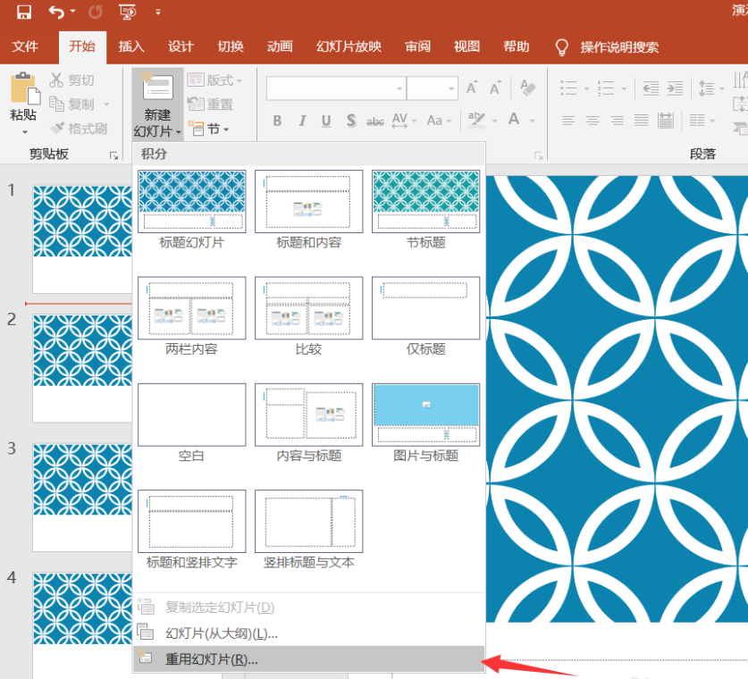 在菜单栏中点击【开始】——【新建幻灯片】——【重用幻灯片】,如图,