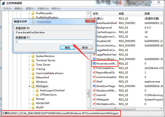 进入注册表编辑器,依次点击【HKEY_LOCAL_MACHINE\\SOFIWARE\\MicRosoft\\Windows NT\\CurrentVersion\\Winlogon】,然后点击Winlogon文件夹中的PowerdownAfterShutdown字符串,进入编辑字符串页面,修改数值数据为1,最后点击确定。