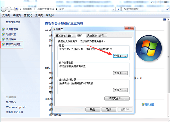 鼠标右击【计算机】图标上,点击【属性】,进入如下界面,然后点击【高级系统设置】,弹出对话框,点击【高级】——【性能】——【设置】,