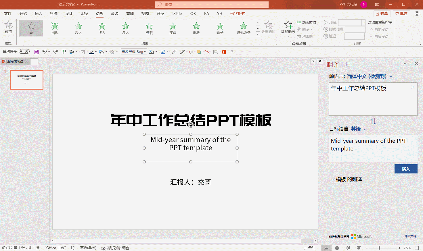 PPT软件自带翻译功能,为了让幻灯片页面内容变得更有质感,我们可以添加一些英文辅助。如图,先选中文本框,在菜单栏点击【审阅】——【翻译】,启用翻译工具,加载几秒,点击插入即可替换中文。
