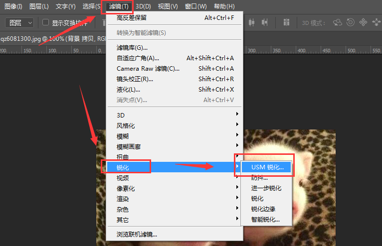 在菜单栏中点击【滤镜】——【锐化】——【USM锐化属性】,如图所示,
